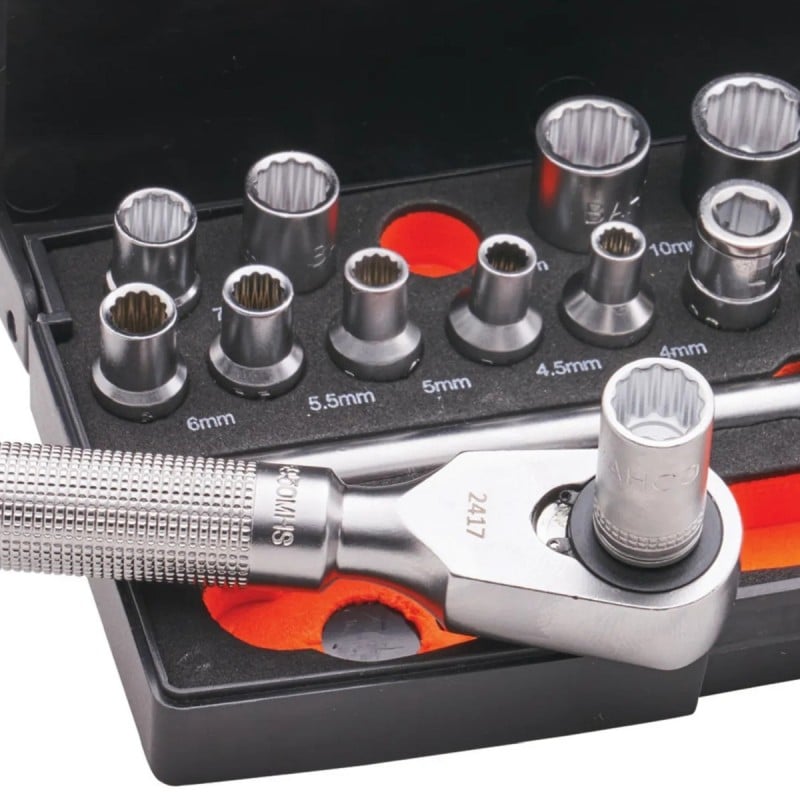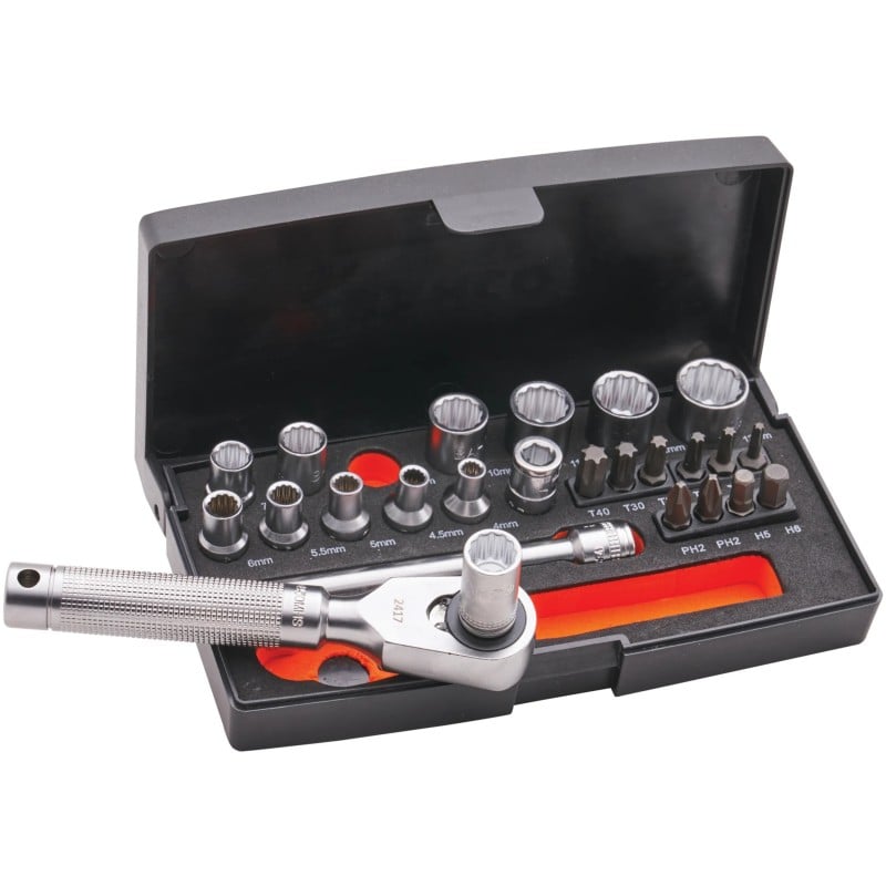The Bahco SL25MHBL Special Edition Socket Set is a compact 25-piece collection made for workshop, automotive, and home use. Each socket and bit is crafted from hardened chrome vanadium steel for long service life. The Dynamic Drive profile provides improved torque and reduces fastener wear. Supplied in a labelled, high-density polypropylene carry case, this set keeps tools organised and ready for use. Its quick-release ratchet and wobble extension offer smooth and practical operation, giving great control when tightening or loosening fittings.