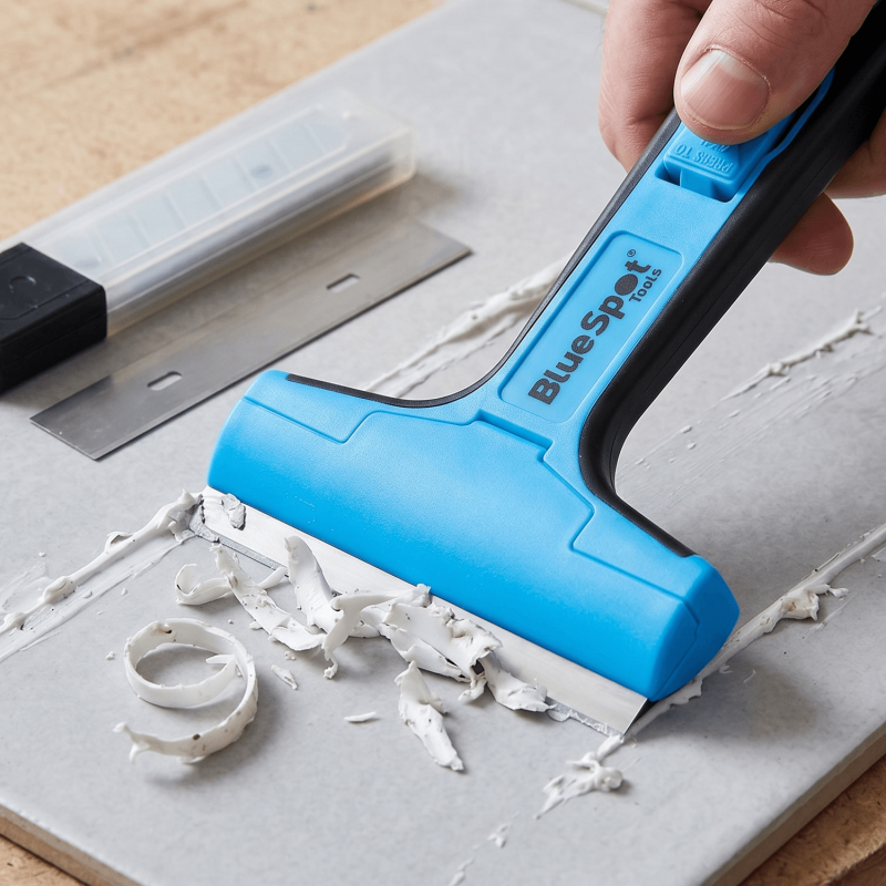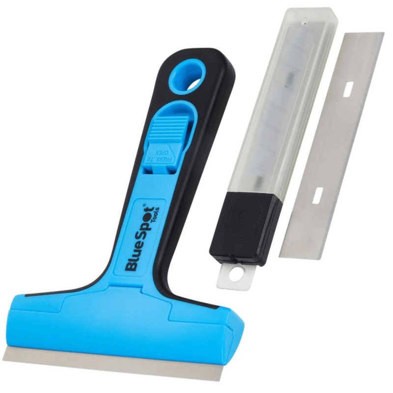 The Blue Spot Tools 100mm Quick Change Blade Scraper removes silicone, scale, and paint from glass and tiles. The press-to-open blade mechanism and anti-slip grip make the job quicker and more controlled. Ten spare blades come included, and the product carries Blue Spot Tools' lifetime guarantee.