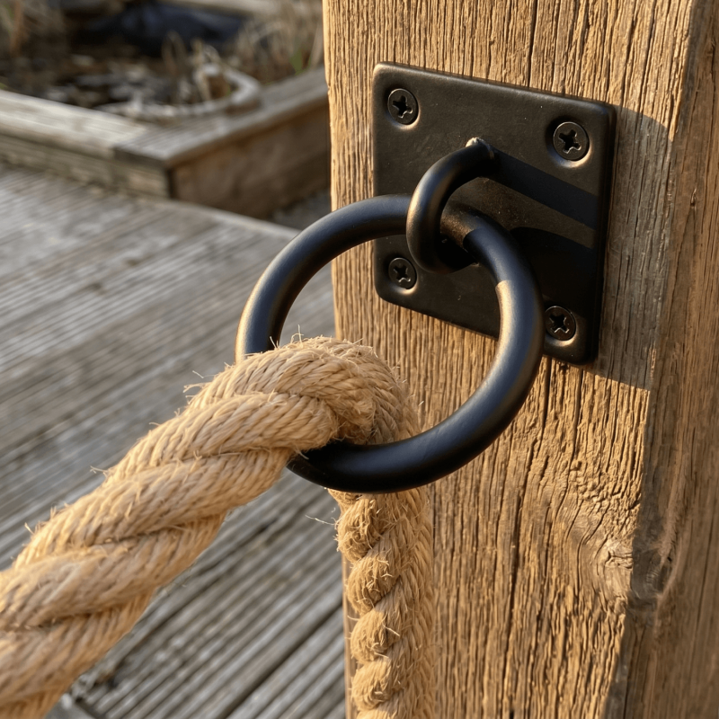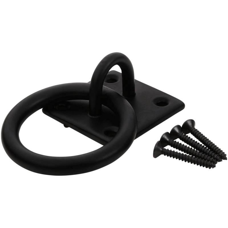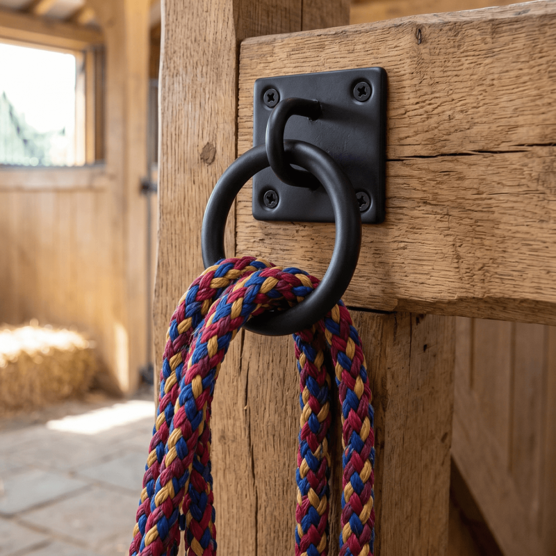 A ring on plate provides a fixed anchor point on a timber or wall surface. It lets you attach ropes, chains, or hooks to structures such as gates, fence posts, and outbuildings.