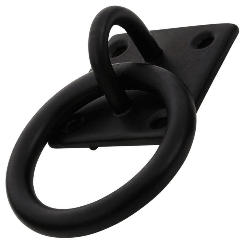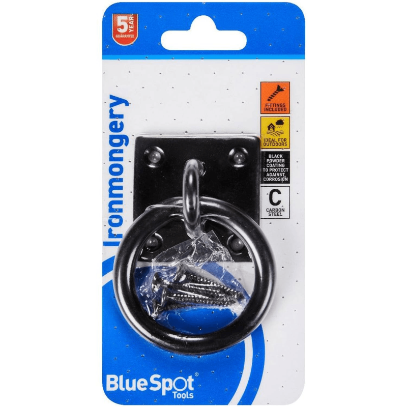 The BlueSpot Tools 50mm x 50mm black powder coated ring on plate is a carbon steel outdoor hardware fitting. It provides a fixed anchor point on timber gates, fences, and shed doors, with a powder coat finish protecting against corrosion. All fixing screws are included.