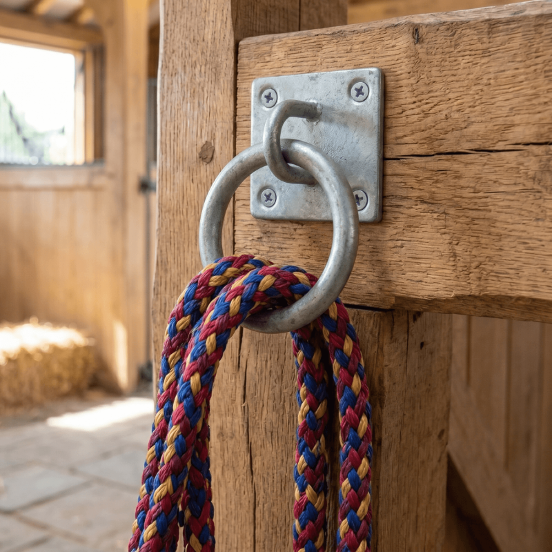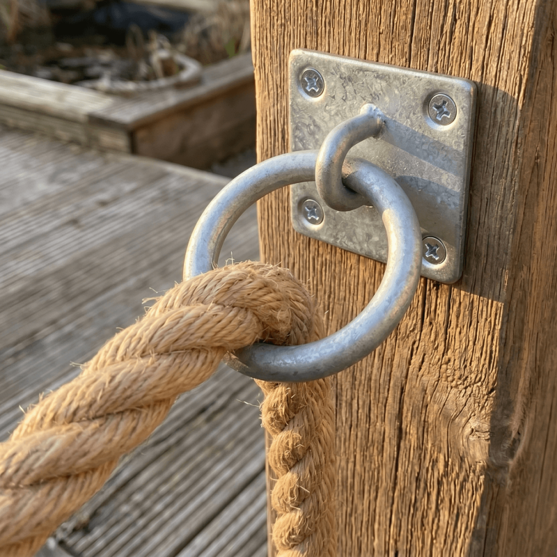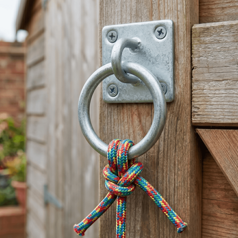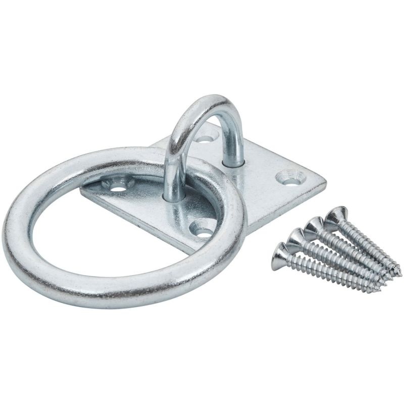 A ring on plate provides a fixed anchor point on a surface. Common uses include securing ropes and chains to gates, fences, shed doors, and other timber structures outdoors.