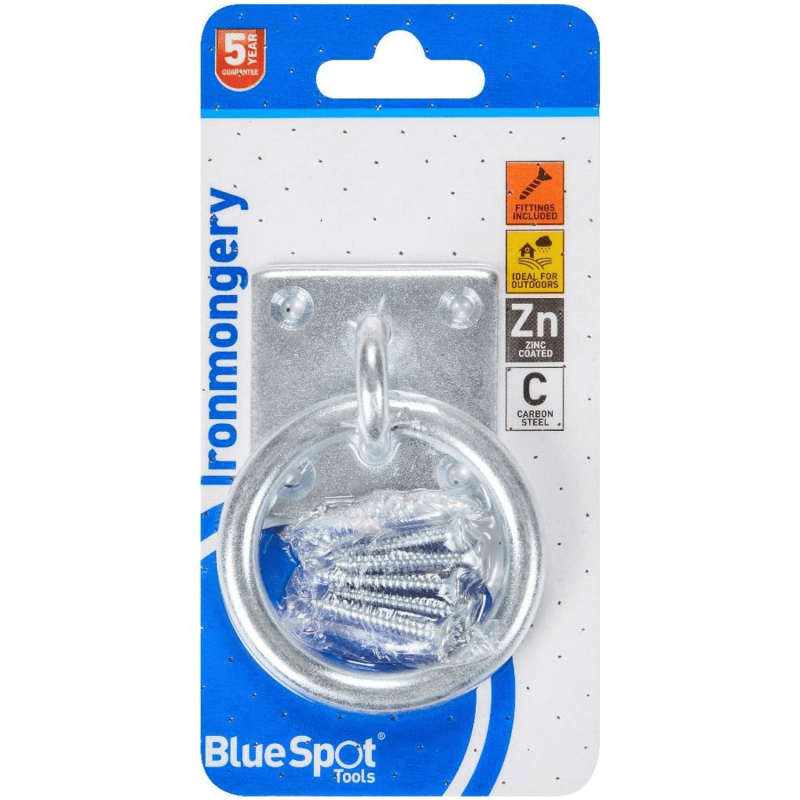 The Blue Spot Tools 78070 is a 50mm x 50mm zinc plated ring on plate, manufactured from carbon steel for outdoor use on wooden gates, fences, and shed doors. The zinc plated finish protects against corrosion, all necessary fittings are included, and the product carries a 5 year Blue Spot Tools guarantee.