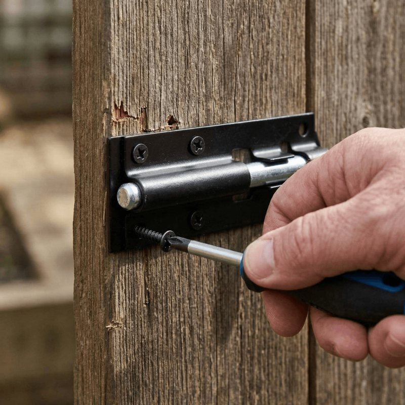 For hardwood gates or frames, always pre-drill to avoid splitting the timber. Use the supplied screws where possible, or replace with stainless steel screws of the same gauge if fitting into hardwood that splits easily.