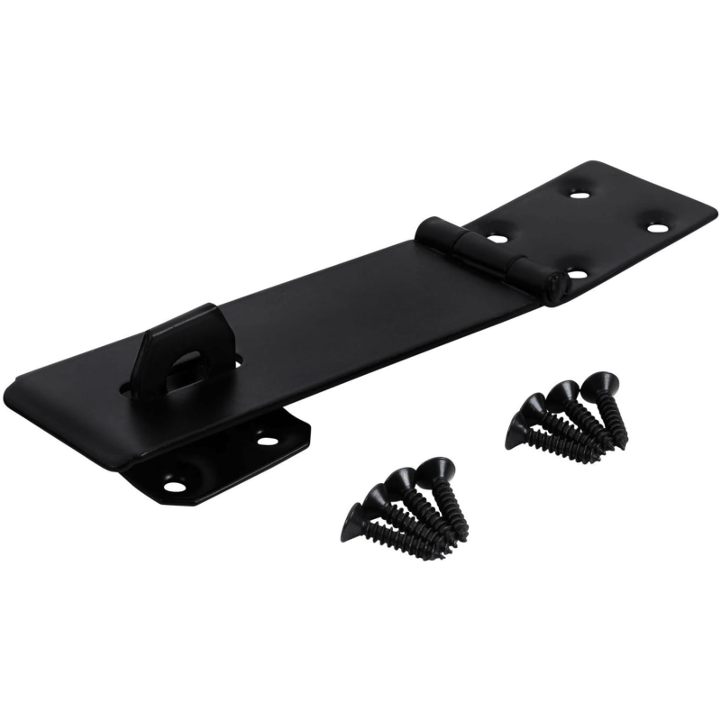 This 115mm hasp and staple from Blue Spot Tools is made from carbon steel with a black powder coat finish. The coating shields the steel from corrosion, making it well-suited to permanent outdoor use on wooden gates, shed doors, and fences.