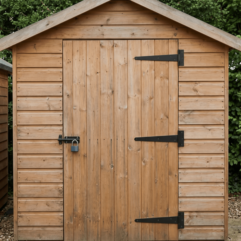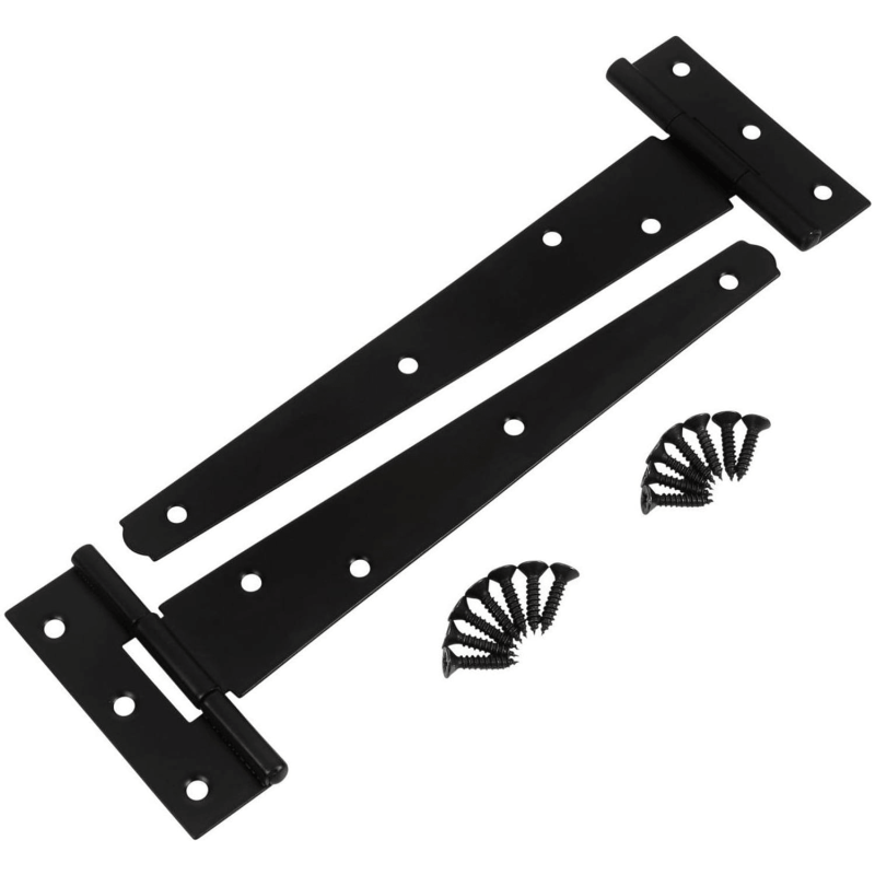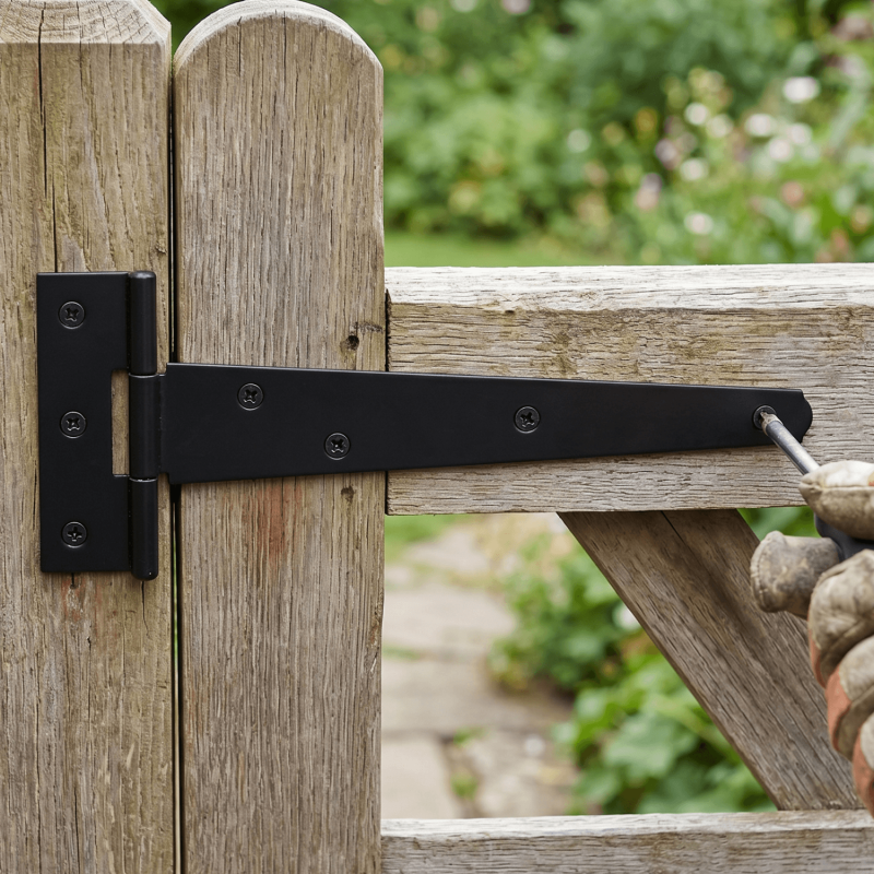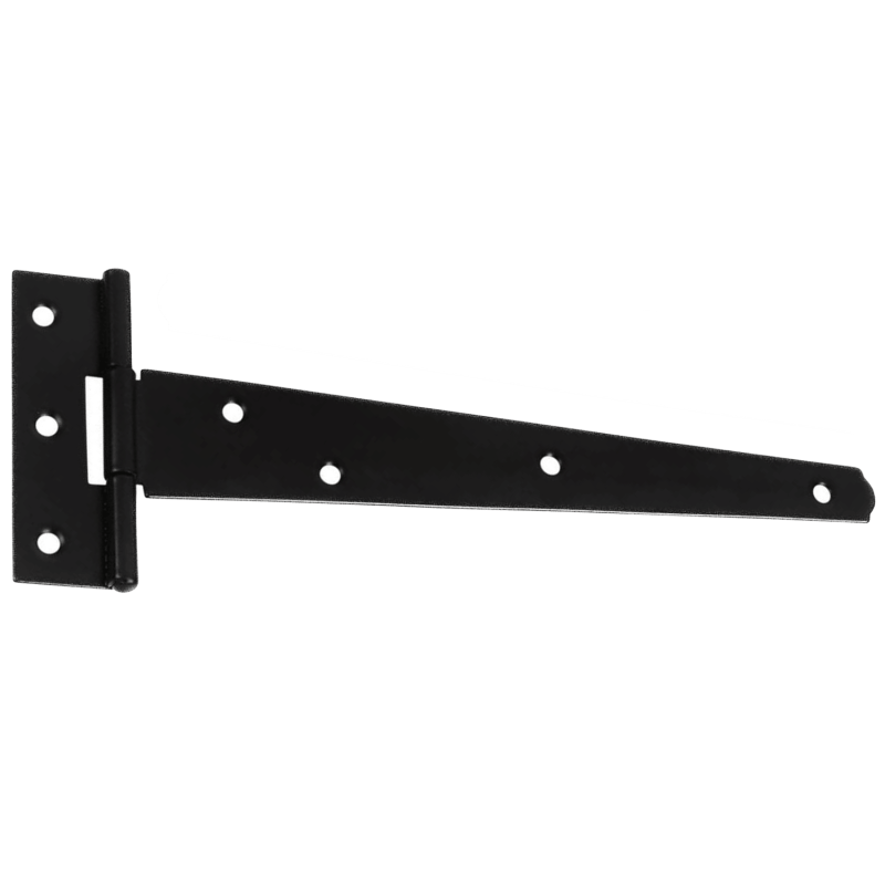 Tee hinges hang wooden gates, shed doors, and fence panels. The long strap fixes flat across the door face, while the shorter plate attaches to the post or frame.