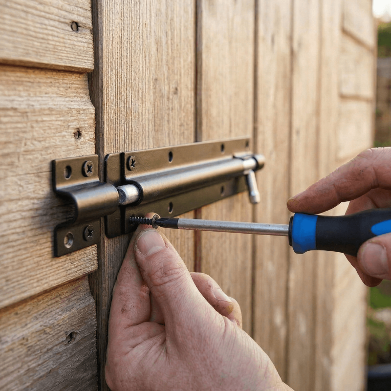 Set the staple keep: Extend the bolt fully to determine the keep position on the frame, mark and drill, then fix the keep so the bolt slides in squarely.