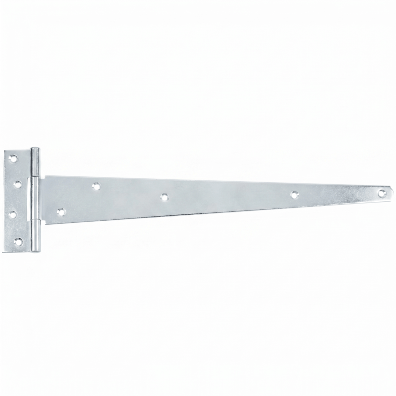A tee hinge has one long strap arm and one short rectangular plate, forming a T shape. A strap hinge has two long arms of similar length. Tee hinges are typically used on single gate leaves fixed to a post, while strap hinges are more common on bi-folding gates where one gate is hung from another.