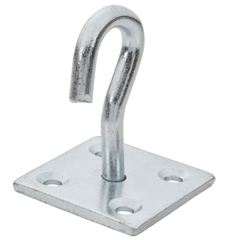 The Blue Spot Tools 50mm x 50mm zinc plated hook on plate is a carbon steel outdoor fixing for permanent installation on wooden gates, fences, shed doors, and timber structures. The zinc plated finish protects against surface rust, all necessary fittings come supplied, and the product carries a 5 year guarantee from Blue Spot Tools.