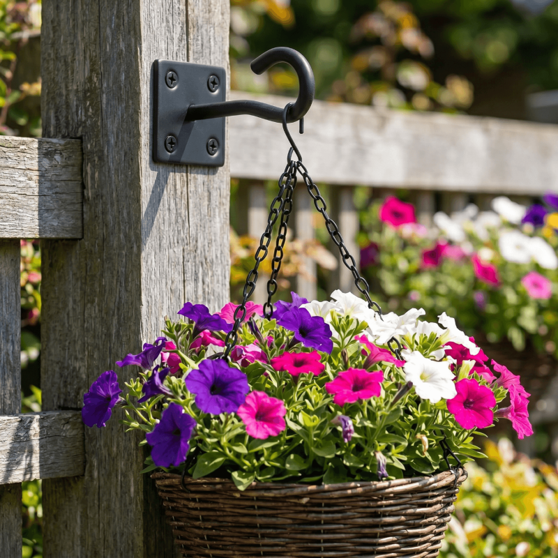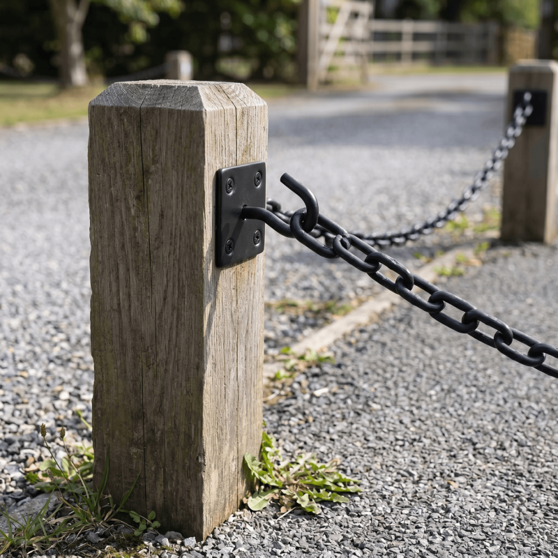 A hook on plate is a mounting bracket that fixes to a timber post, fence, wall, or frame to provide a fixed hanging point. Common uses include suspending chains between posts, hanging baskets, supporting lanterns or bird feeders, and attaching ropes or cordage to outdoor structures.
