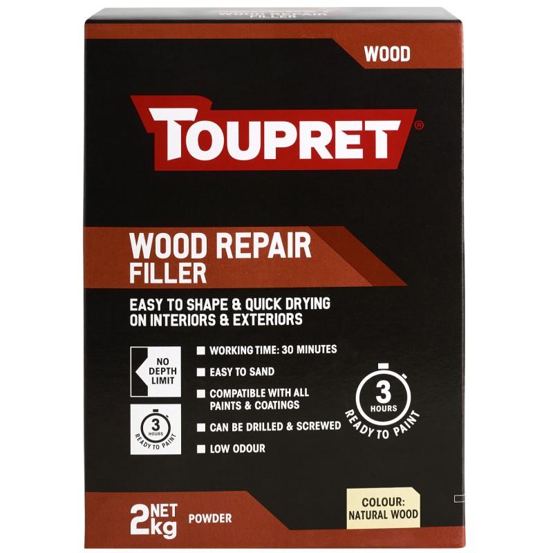 Toupret Wood Repair Filler (Natural Wood) is a fast-setting, powder-based filler for repairing and restoring interior and exterior wood. With no depth limit, a 30-minute working time and a 3-hour overcoating window, it handles a wide range of wood repair tasks. Once dry, it sands smooth and takes any conventional paint, varnish or stain - backed by a 12-month guarantee from purchase.