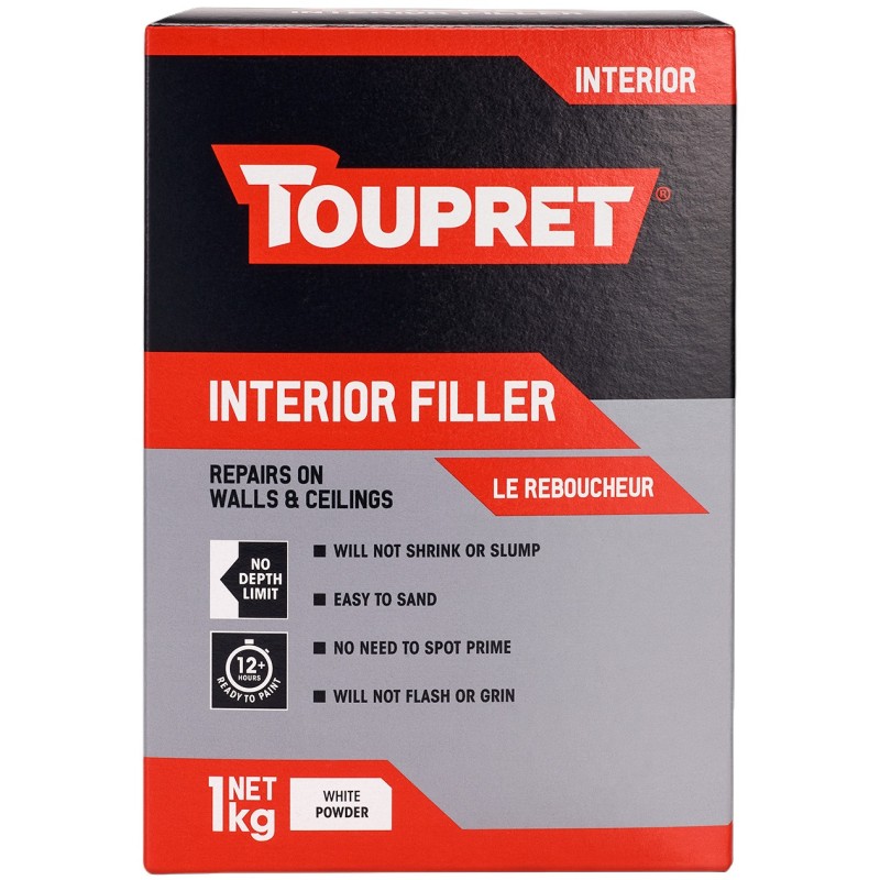 Toupret Interior Filler 1kg is a professional powder filler for repairing walls and ceilings indoors. It fills to any depth in a single coat, removing the need for multiple passes. The formula will not shrink or slump, so repairs stay flush with the surrounding surface. This filler sets in 30 to 40 minutes and requires no spot priming before you paint. It sands smoothly and will not flash or grin through subsequent coats. Once dry, it accepts any paint, filler, or wall coating directly.