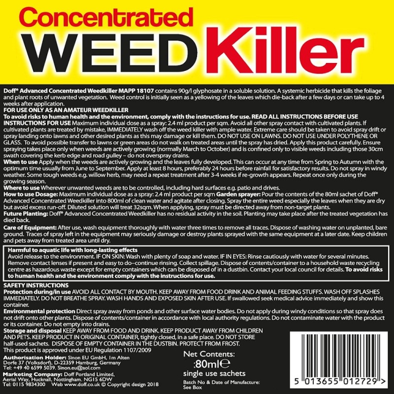 Doff Advanced 10 Sachet Weed and Root Killer Concentrated Weedkiller is a strong glyphosate-based treatment designed for controlling a wide range of unwanted garden and outdoor weeds. This systemic formula works through the foliage and down into the roots, helping tackle both annual weeds and deep-rooted perennial weeds with thorough action.
