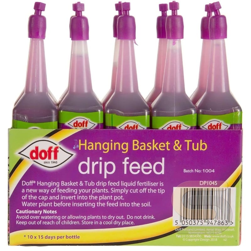 Doff Hanging Basket and Tub 150 Day Drip Feeders in a Pack of 10 offer a simple convenient and cost effective way to provide regular nutrition to hanging baskets, tubs, pots, and other container plants. Each ready-to-use feeder is designed to release a balanced liquid feed gradually over 15 days, helping plants stay healthy, well fed, and full of colour throughout the growing season.