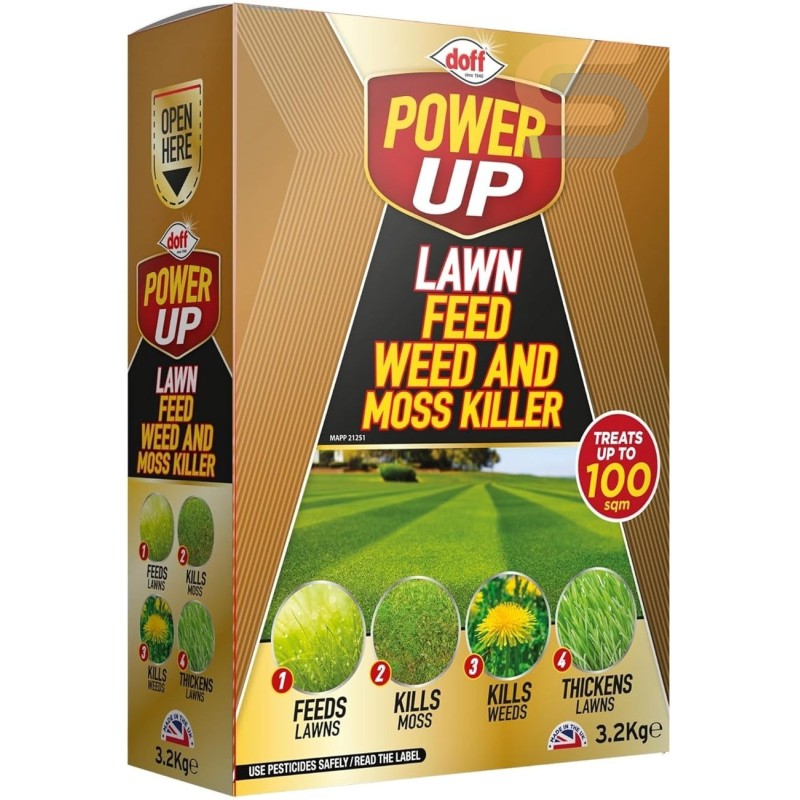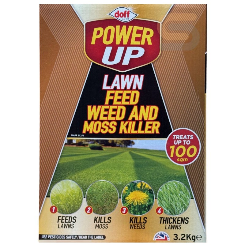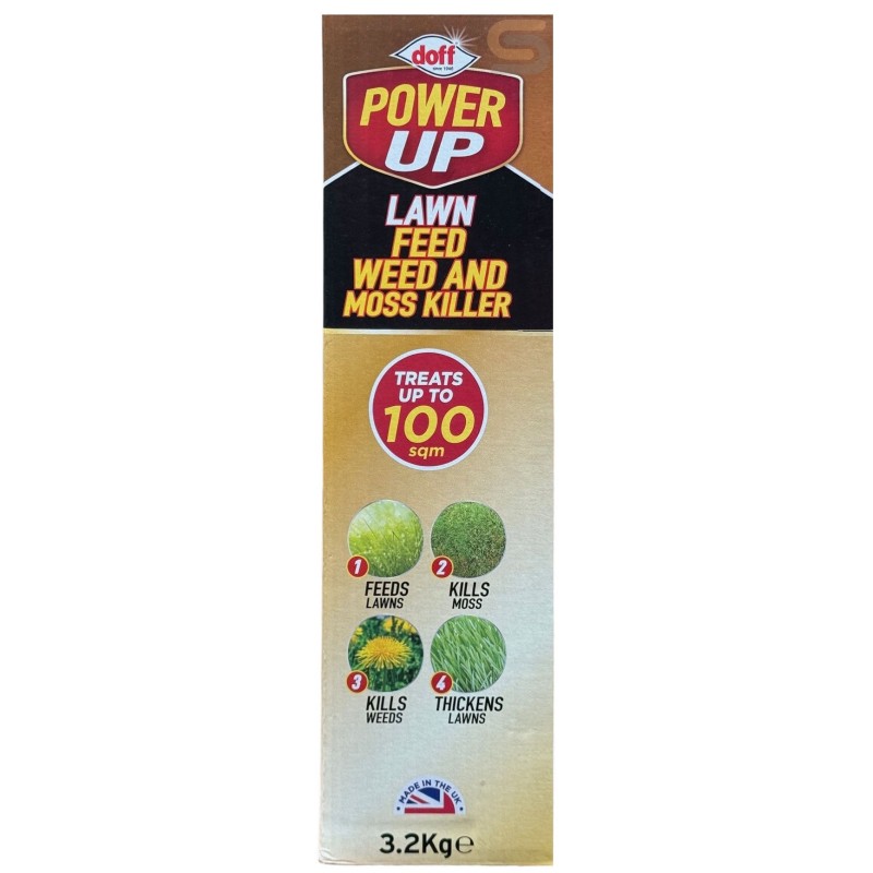 Doff Power Up 3.2kg Complete Lawn Grass Feed Weed and Moss Killer a larger box all-in-one lawn treatment designed for established lawns that need feeding, weed control and moss treatment in one go. This granular formula helps improve lawn colour and vigour while tackling common broad-leaved weeds and reducing moss, making it a practical choice for keeping larger garden lawns looking greener, thicker and better maintained. It is ideal for routine seasonal lawn care where several lawn issues need addressing at the same time.
