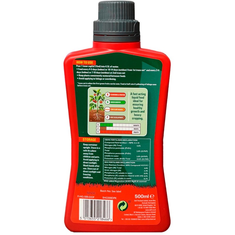 Suitable not only for tomatoes but also for courgettes, aubergines and a wide range of flowering plants, this versatile concentrate is easy to dilute and apply. The handy 500ml bottle makes up to 150 litres of feed, offering excellent value for regular use in greenhouses, grow bags, patio containers and garden beds.