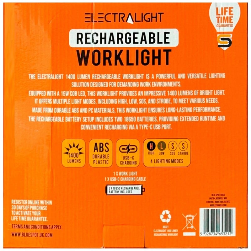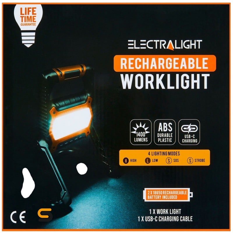 The Electralight 1400 Lumen Rechargeable Work Light is a powerful and lighting solution with a multi angle stand for demanding trade and DIY environments. A high-output 15W COB LED delivers up to 1400 lumens of bright, even illumination, ideal for garages, workshops, sites and vehicle repairs. Multiple light modes, including high, low, SOS and strobe, allow you to tailor the output to your task or emergency situation.