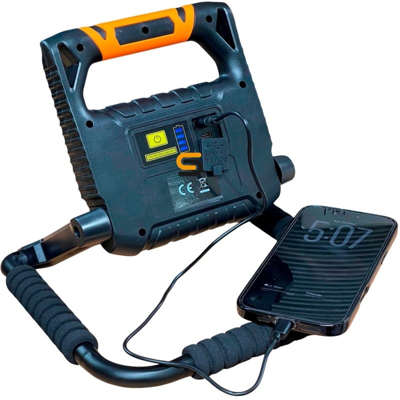 Featuring a fold-flat multi-angle stand, this work light is easy to store and simple to position at the perfect angle. Robust ABS and PC construction, combined with two 18650 rechargeable batteries and convenient USB Type-C charging, offers long-lasting performance and reliable runtime wherever you need portable light.
