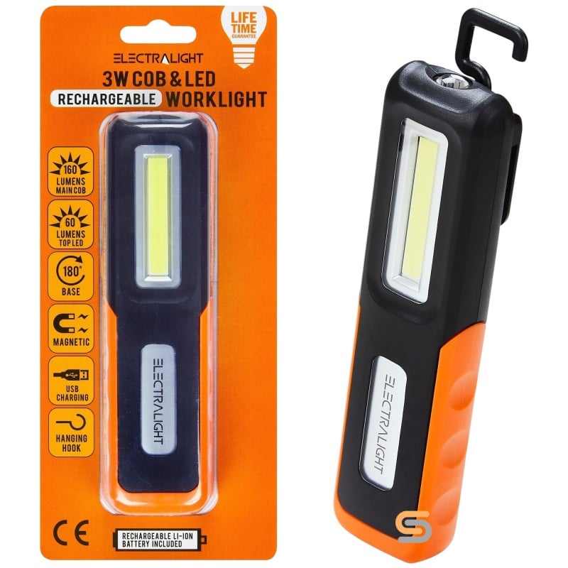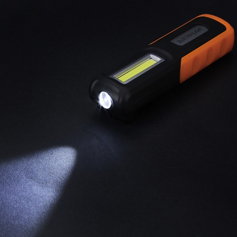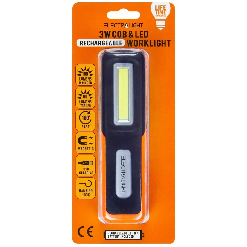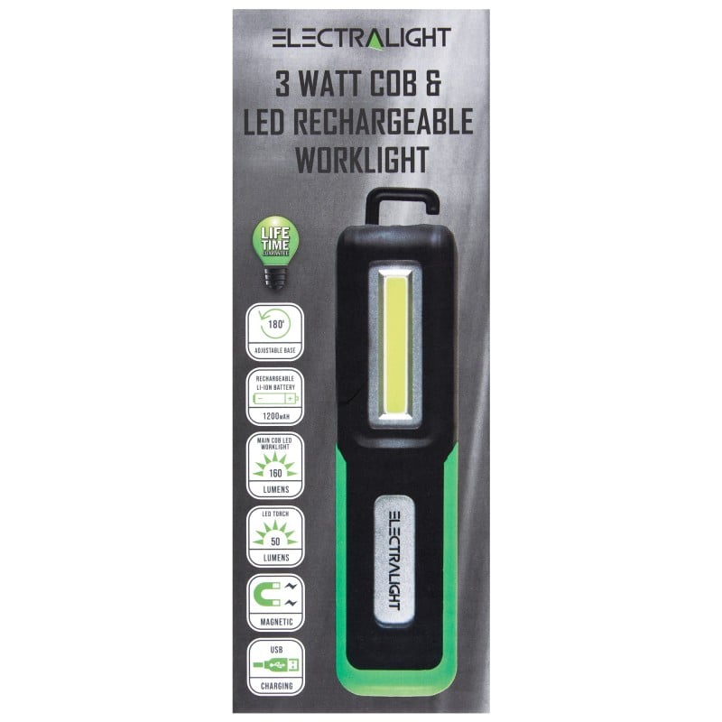 The Electralight 3 Watt COB LED Rechargeable Work Light is a compact, versatile light source for DIY and trade use. The main COB panel delivers up to 160 lumens of bright, even light, ideal for close-up work in garages, workshops and around the home. A secondary LED torch in the head provides a focused beam when you need to pick out smaller details or check tight spaces.