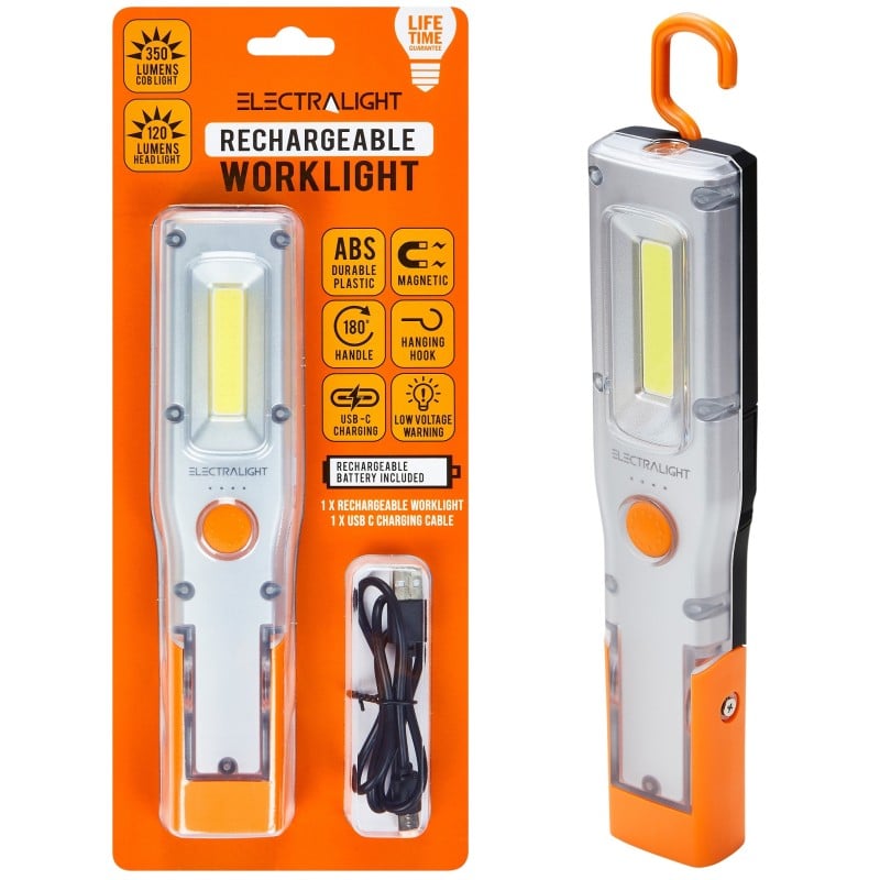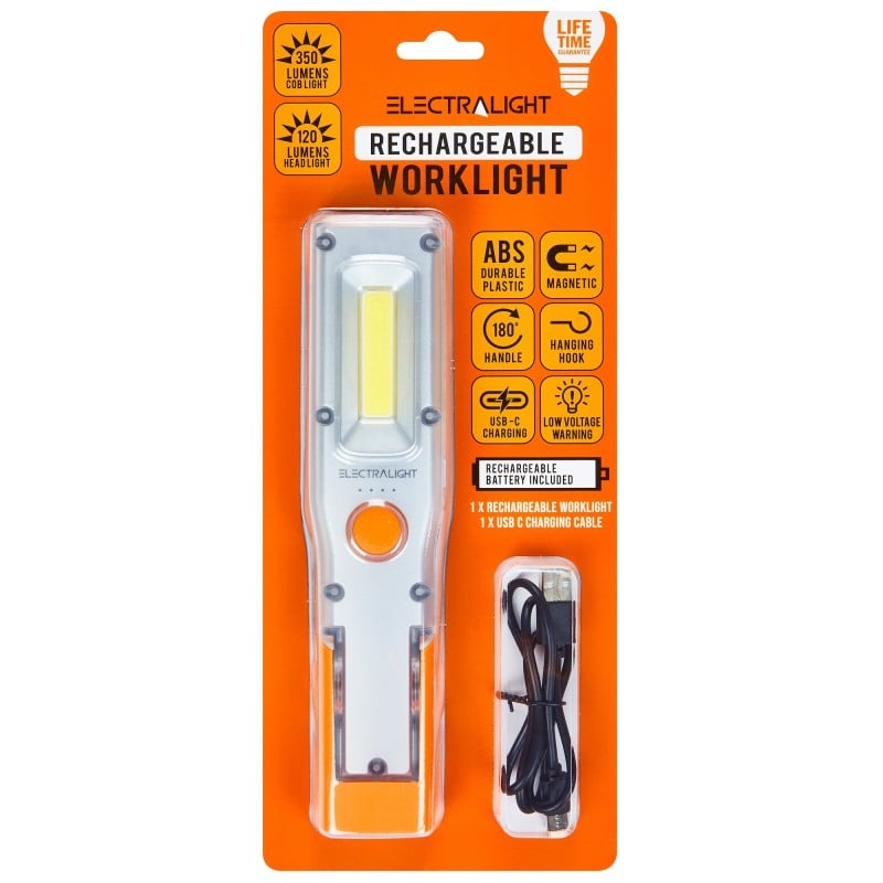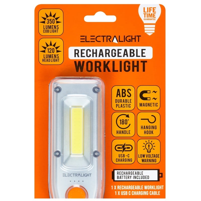 The Electralight 350 Lumen Rechargeable Work Light is a robust, versatile lighting solution for both DIY and trade users. Built from durable ABS and PC, it provides bright, reliable illumination in garages, workshops, vehicles and around the home. The main COB panel outputs up to 350 lumens of wide, even light, while the head torch delivers 120 lumens for focused inspection work in tighter spaces.