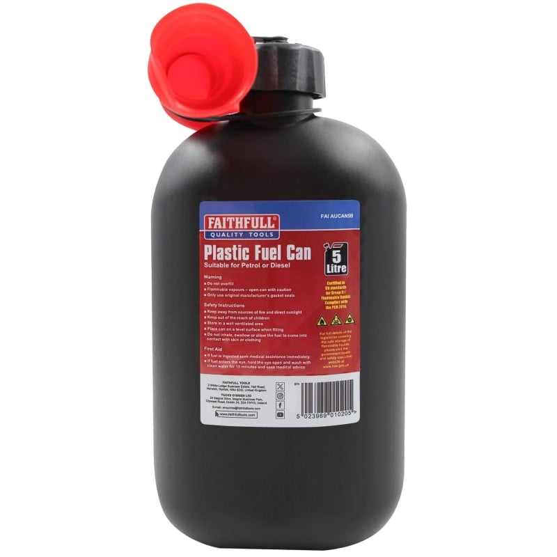 The Faithfull 5 Litre Black Plastic Fuel Can is a heavy-duty, legally compliant container designed for the safe storage and transport of diesel, heating fuel, or mixed fuels such as petrol. Manufactured from high-density polyethylene (HDPE), this can provides excellent resistance to impact, chemicals, and corrosion—ensuring long-term, dependable use in both domestic and professional environments.