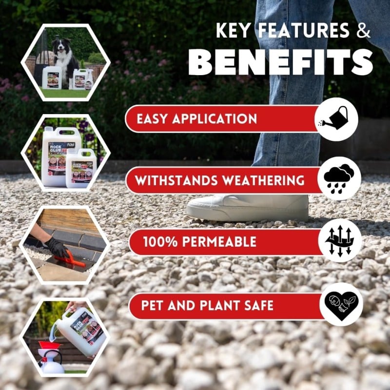 Flow Rock Glue PRO is a clear, water-based binding resin developed to take control of loose decorative materials in the garden. When applied to gravel, slate, bark, mulch or other similar aggregates, it helps form a lightly bonded, tidy surface that keeps its natural look but is far less likely to kick out, wash away or migrate onto lawns and paving.