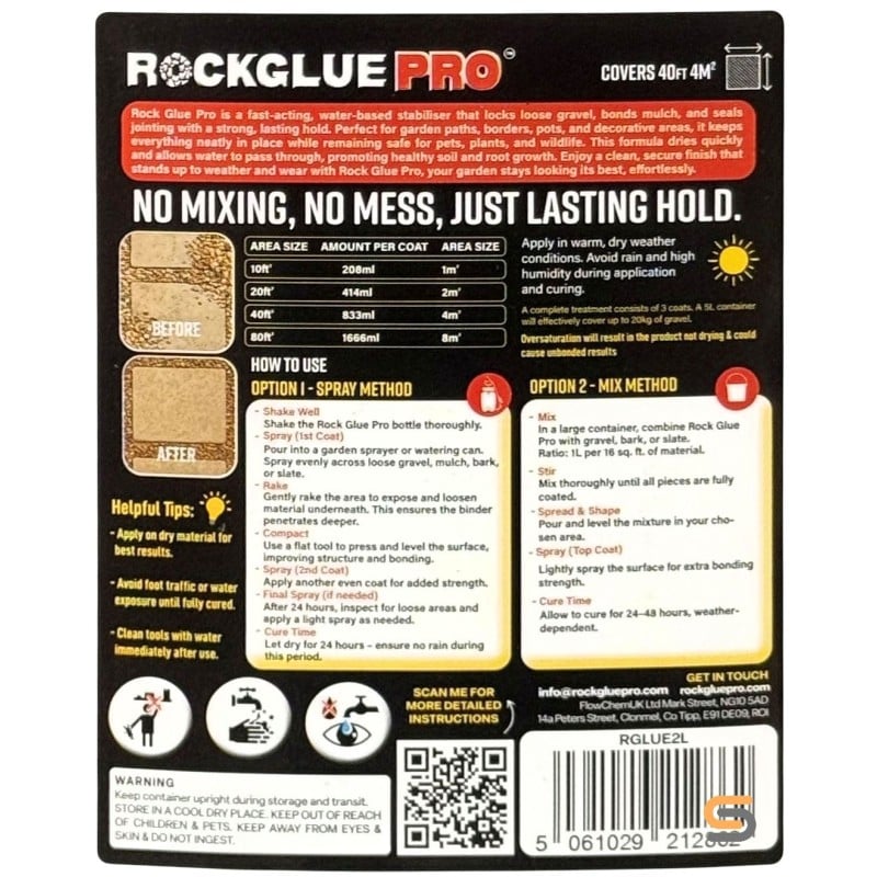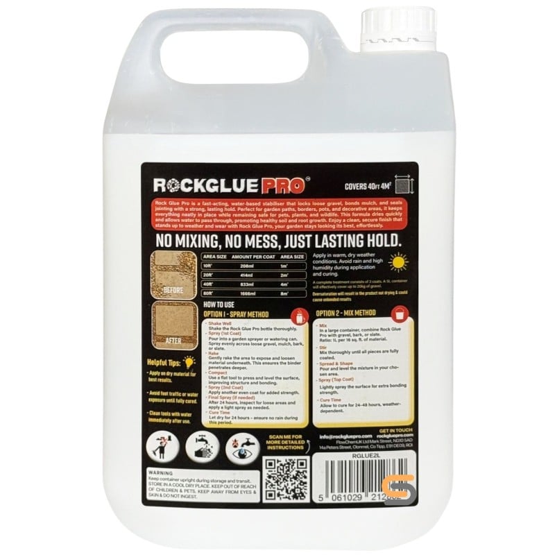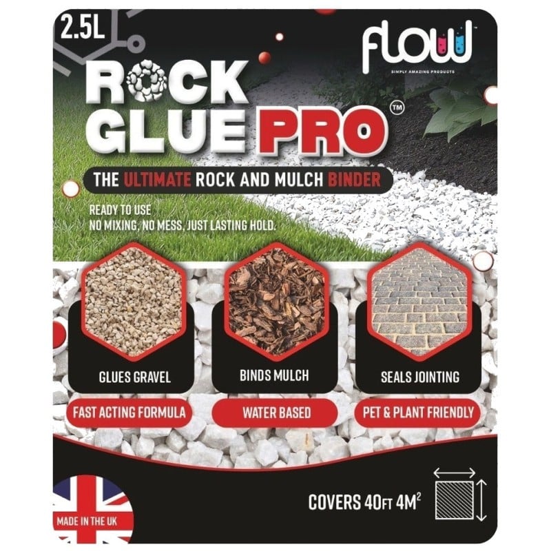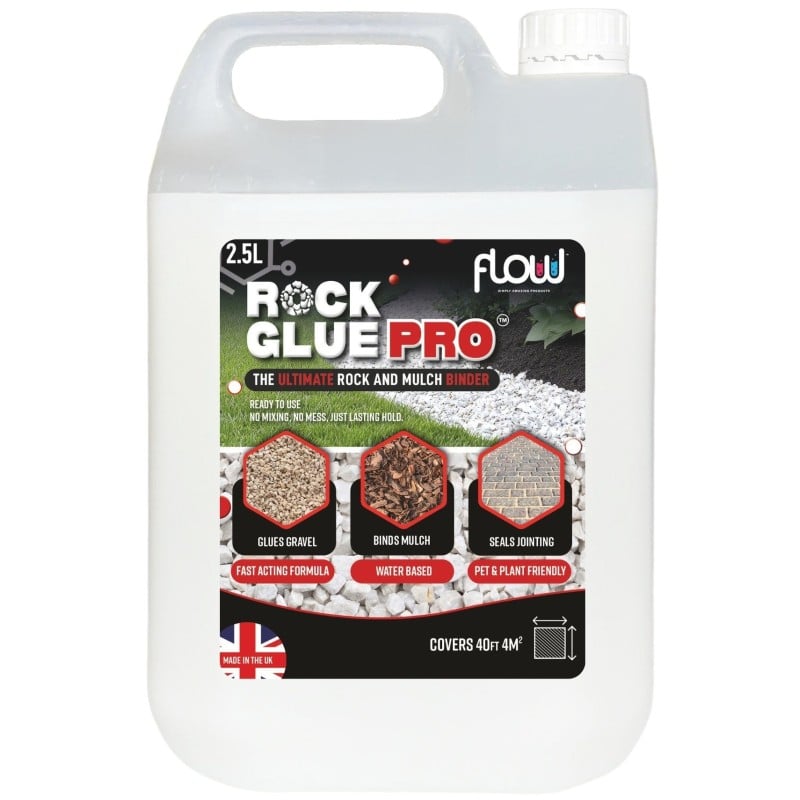 Flow Rock Glue PRO 2.5 Litre is a compact pack of the same water-based binder used in the larger trade sizes, ideal for smaller garden projects and touch-up work. It’s designed to be applied over or mixed through gravel, slate chippings, bark, mulch and other decorative aggregates to help keep them where you want them.