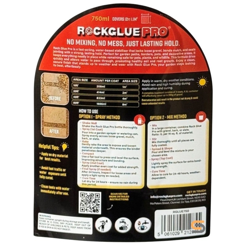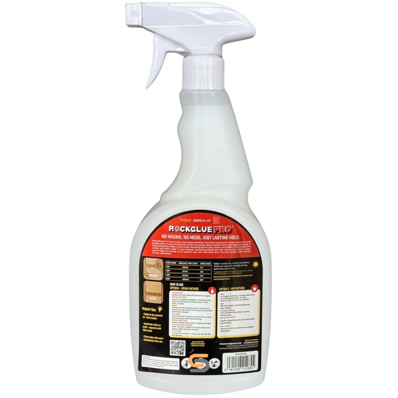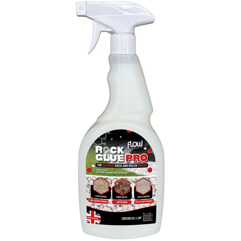 Flow Rock Glue PRO 750ml Spray is a ready-to-use, trigger-spray version of the popular Rock Glue binder, designed for small decorative areas, edges and detail work. Ideal for pots, planters, feature stones, narrow borders, path edges and troublesome scatter spots, it helps hold loose gravel, slate, bark and mulch in place without changing the natural look of the surface.