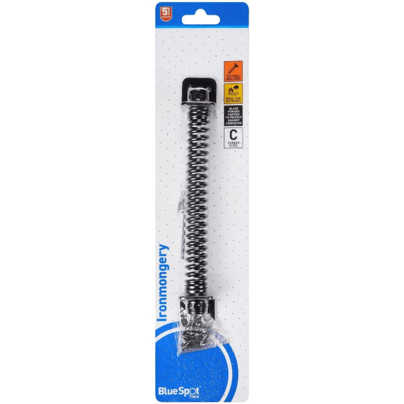 The Blue Spot Tools 204mm black powder-coated gate spring is a carbon steel self-closing spring for permanent outdoor use on wooden gates, fences, and shed doors. It comes with all necessary fittings and is backed by a 5-year guarantee.