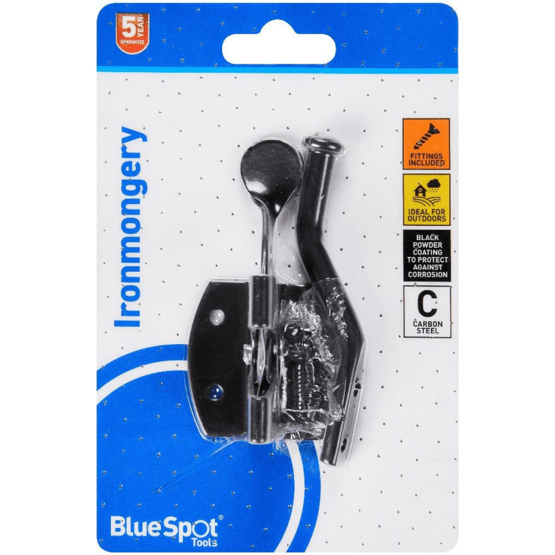 The Blue Spot Tools 50mm black powder coated auto gate latch is a carbon steel fitting built for permanent outdoor use on wooden gates, fences, and shed doors. The latch catches automatically on closing, all fixings are included, and a 5 year guarantee is provided.