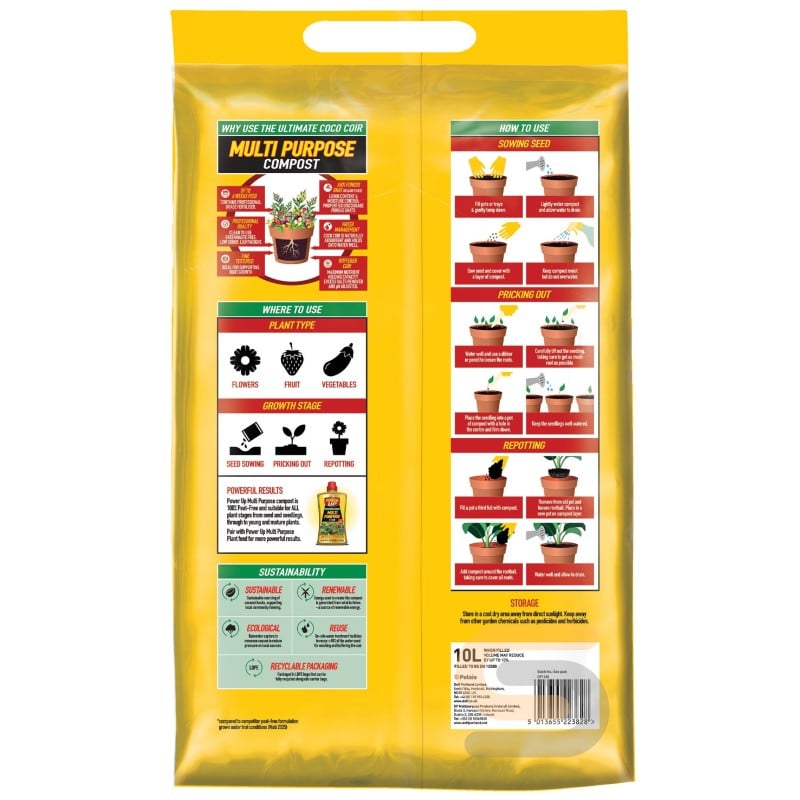 It is a general-purpose peat-free compost suitable for seed sowing, potting, repotting, and planting flowers, fruit, and vegetables in pots, containers, and around the garden.