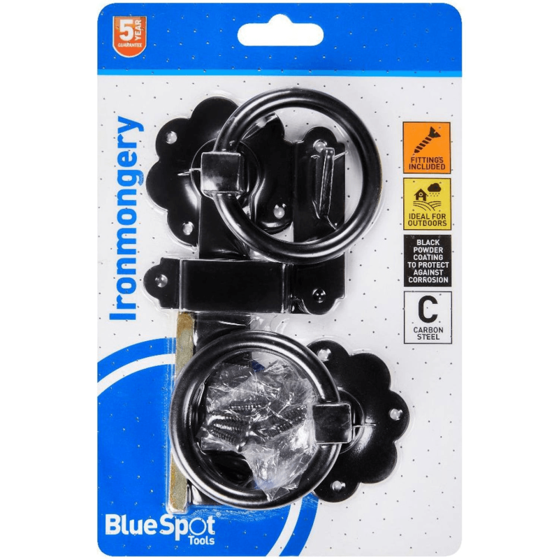 The Blue Spot Tools 152mm ring latch offers a carbon steel build with a black powder coated finish, designed for permanent outdoor use on wooden gates, fences, and outbuilding doors. All necessary fixings are included, and the latch is backed by a 5 year guarantee from Blue Spot Tools.