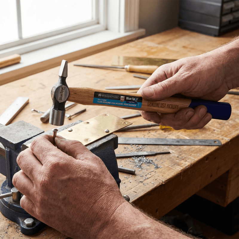 The Blue Spot Tools 4oz (110g) Pein Hammer features a head made from heat-treated, hardened carbon steel. The head is forged for added strength and resists deforming under repeated impact. At 4oz (110g), this tool suits fine joinery, cabinet work, and driving small pins.