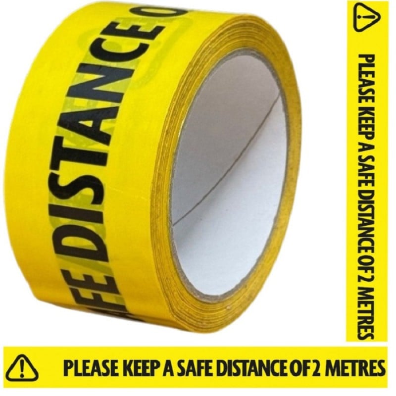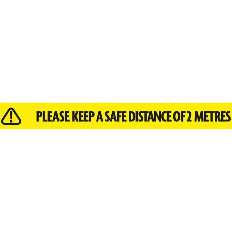 It reads “PLEASE KEEP A SAFE DISTANCE OF 2 METRES” in black text on a hi-vis yellow background.