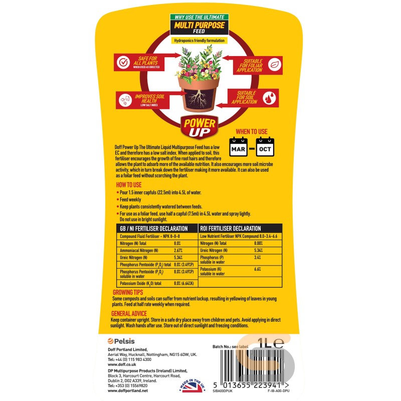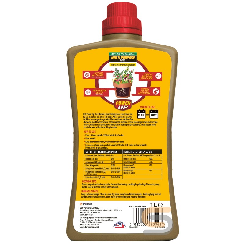Doff 1 Litre POWER UP Ultimate Multipurpose Plant Feed Concentrate a versatile liquid fertiliser designed to support healthy growth across a wide range of garden plants. Suitable for flowers, fruit, vegetables, baskets, containers and general planting, this concentrated formula helps promote greener foliage, stronger root development, improved flowering and better fruit production. It is a practical all-round feed for routine use during the main growing season.