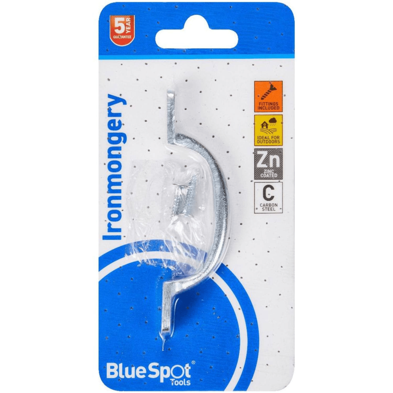 The Blue Spot Tools 100mm zinc-plated hot bed handle is a carbon steel bow-style pull handle for outdoor use on wooden gates, fences, and shed doors. It comes with all necessary fittings and carries a 5-year Blue Spot Tools guarantee.