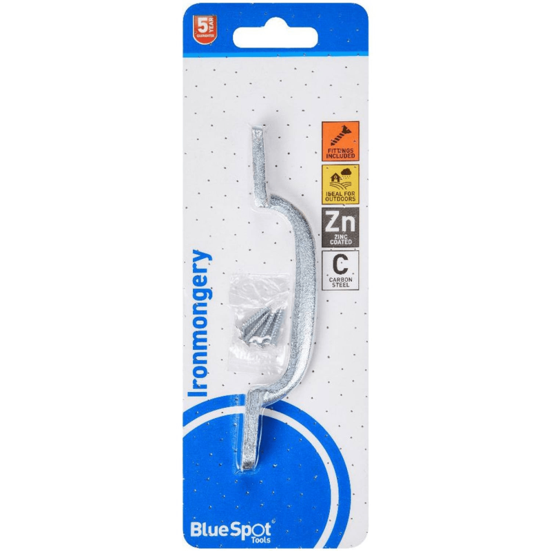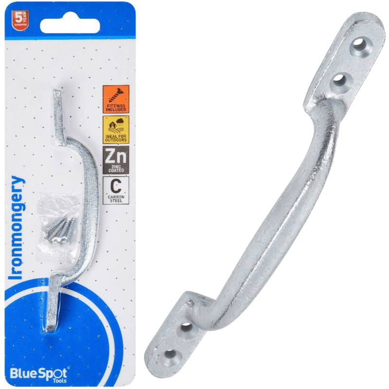 The Blue Spot Tools 150mm Carbon Steel Hot Bed Handle suits outdoor use on wooden gates, fences, and shed doors. A zinc-plated finish protects against corrosion, and all necessary screws are included. The handle carries a 5-year Blue Spot Tools guarantee.