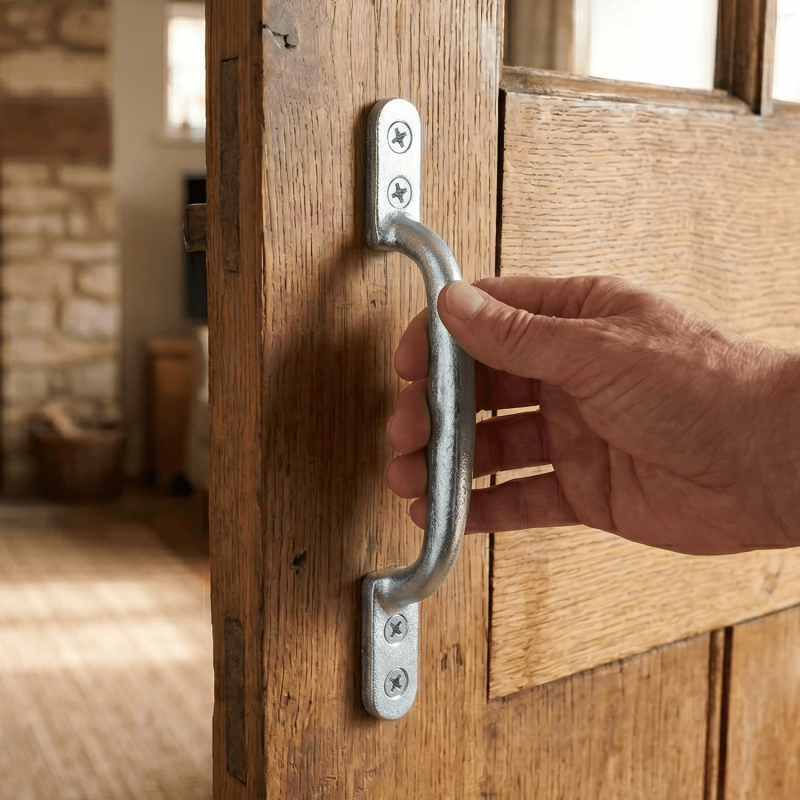 A hot bed handle is a traditional pull handle used on gates, shed doors, and other exterior wooden structures. It features an arched bar fixed at both ends, forming a hand grip for opening and closing doors.