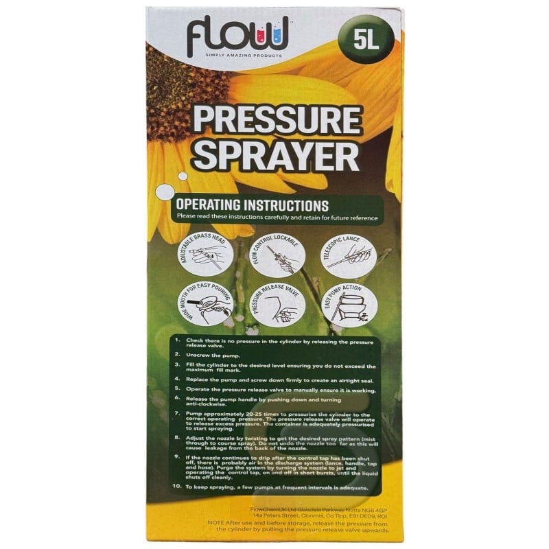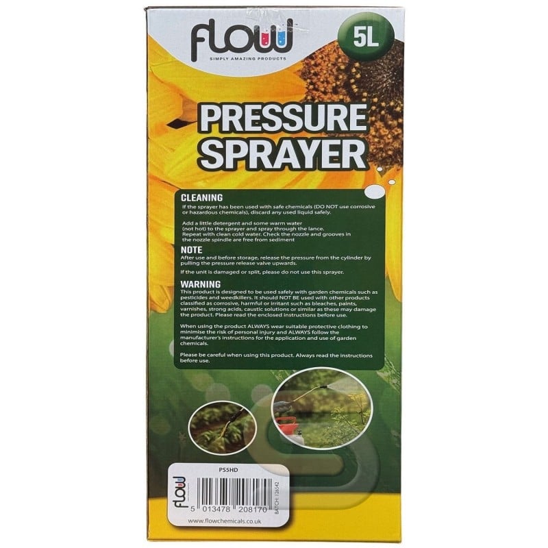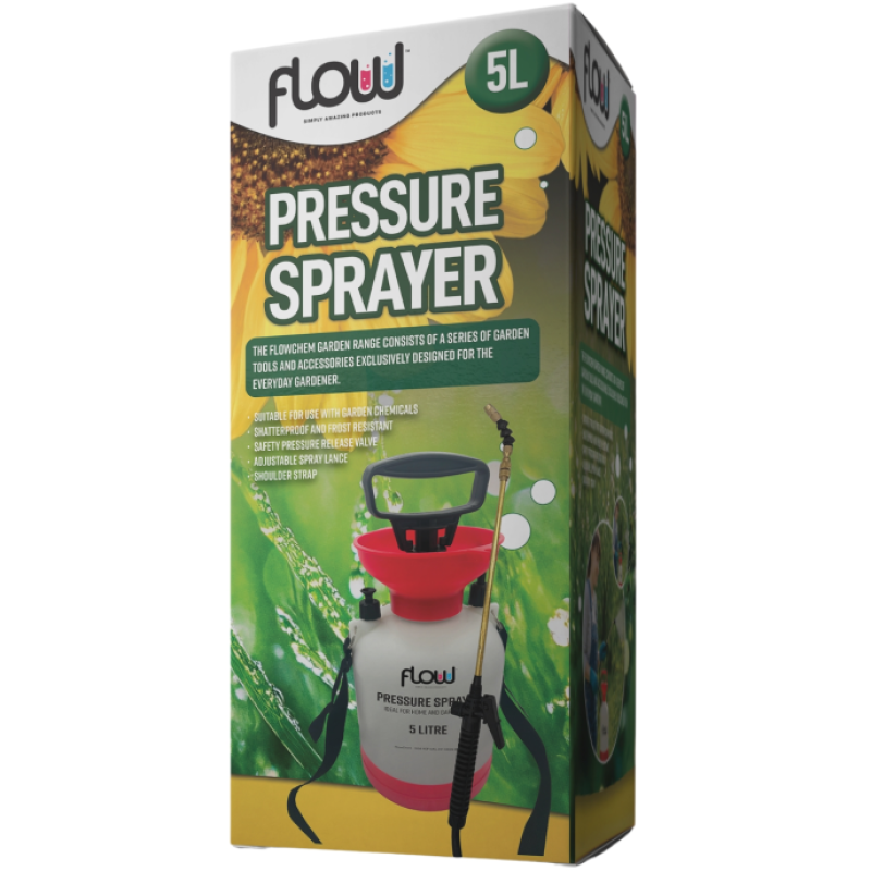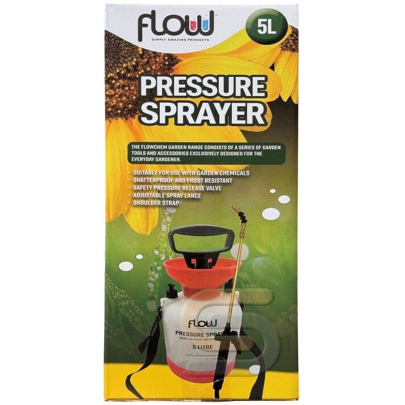 Flow Garden Hand Pump Spray Pressure Sprayer 5 Litre PS5HD is a practical and reliable sprayer designed for everyday use around the garden, greenhouse and home. With a generous 5 litre capacity, it allows you to cover larger areas with fewer refills, making it ideal for watering plants, applying liquid feeds and using a wide range of water-based garden treatments. Built for convenience, it features a long reach lance, adjustable nozzle, trigger lock and carrying strap for easier handling during longer jobs.