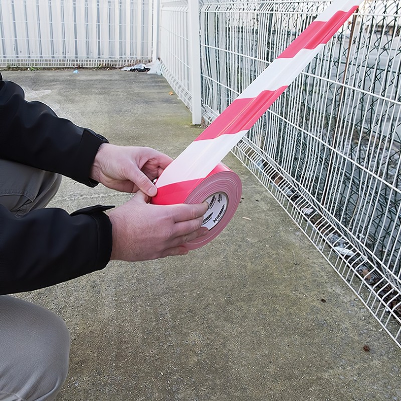 Mammoth 75mm x 500m Red and white Barrier safety tape that can be used to mark out and cordon off areas that may be a hazard providing a clear visual warning for safety and security, can be used in public security practise in crowd control. Non-adhesive barrier tape for cordoning off areas made from high strength HDPE film and is waterproof and weatherproof and can be used internally or externally, ideal for warehouse aisles, building sites, crowd control and more.