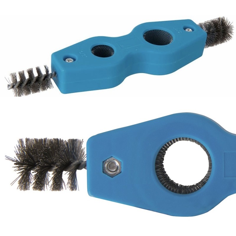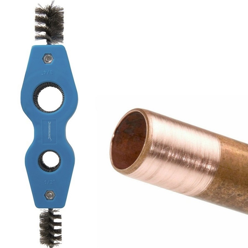 The tool uses stiff steel bristles to provide effective cleaning action on copper pipe and fittings.