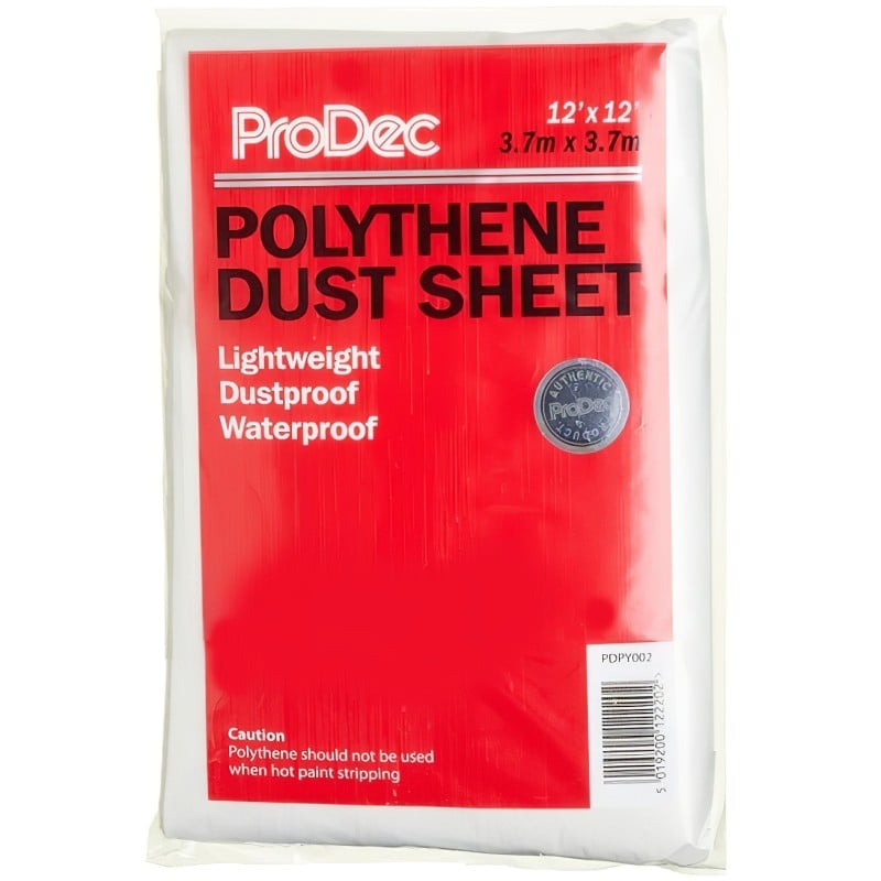 ProDec PDPY002 12ft x 12ft Decorators Multi-Use Polythene Lightweight Dust Sheet a handy larger-size protection sheet. Designed for decorating, cleaning, renovation and general household covering jobs. Made from lightweight translucent polythene, it is ideal for shielding bigger floor areas, furniture, doors, worktops and fittings from dust, dirt, paint splashes and moisture. Easy to unfold, cut and tape into place.