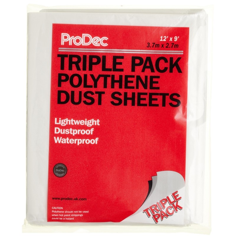 ProDec PDPY009 12ft x 9ft Polythene Lightweight Dust Sheet Triple Pack is a practical all-purpose protection sheet set for decorating, cleaning, storage and general DIY use. Supplied as a pack of 3 clear polythene sheets, these lightweight covers are ideal for protecting furniture, floors, doors, worktops and fittings from dust, dirt, paint splashes and moisture.