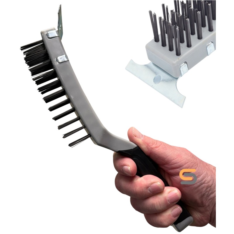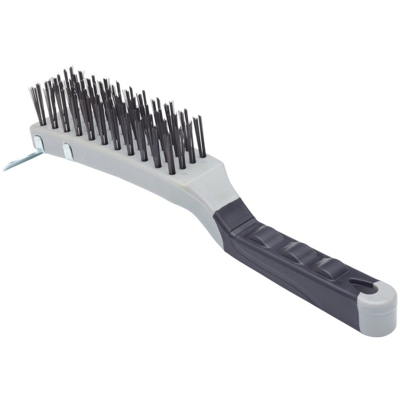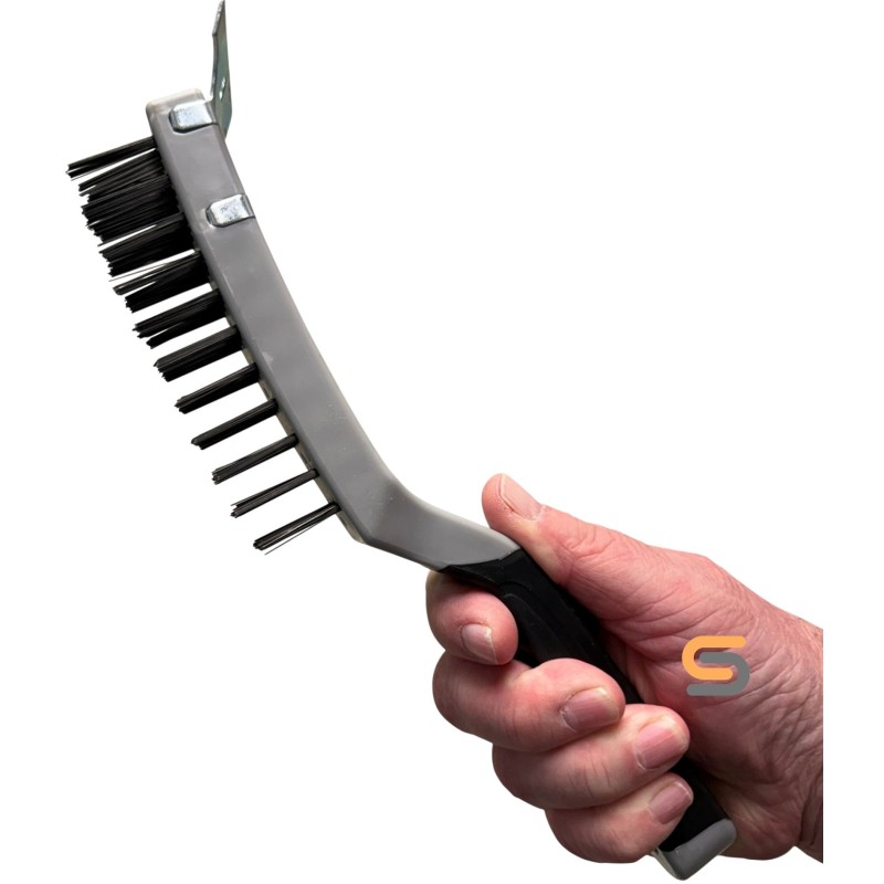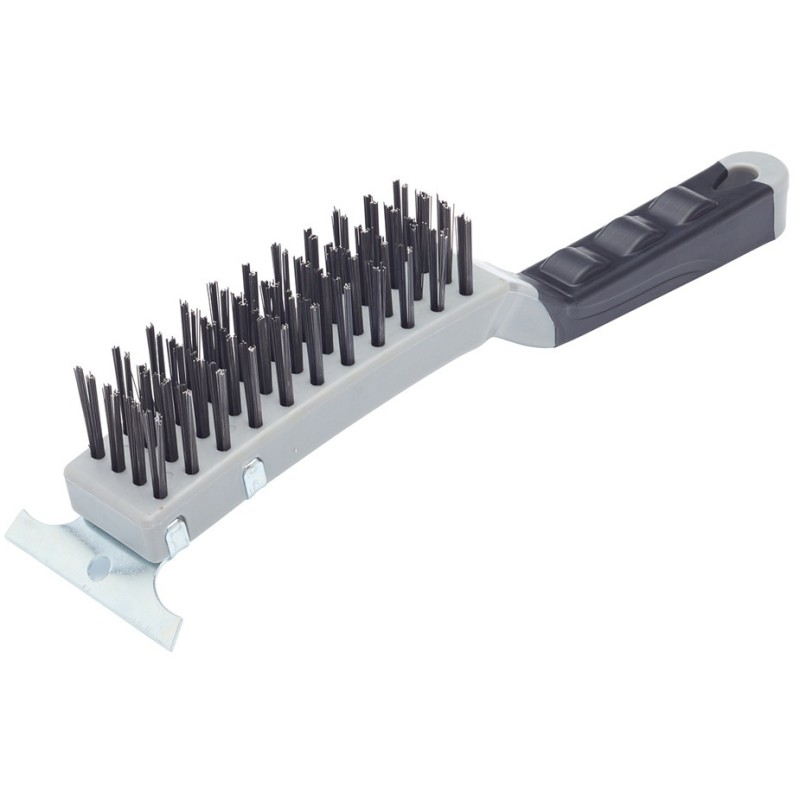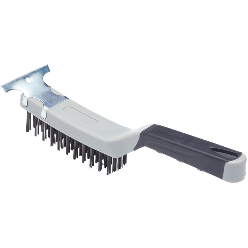 Ideal for removing rust, paint, varnish, grout, dirt, moss, algae, heavy grime and welding slag, this 11" brush features a contoured, rubberised handle for a secure and comfortable grip. The integrated steel scraper at the end helps break up stubborn deposits and lets you rake out narrow gaps, corners and joints quickly and efficiently.