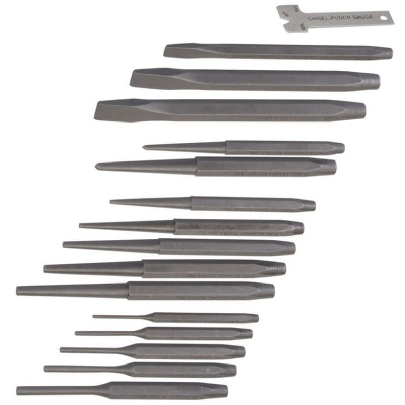 The set includes 3 cold chisels, 2 centre punches, 5 pin punches, 5 taper punches and 1 chisel and punch gauge, all supplied in a storage wallet.