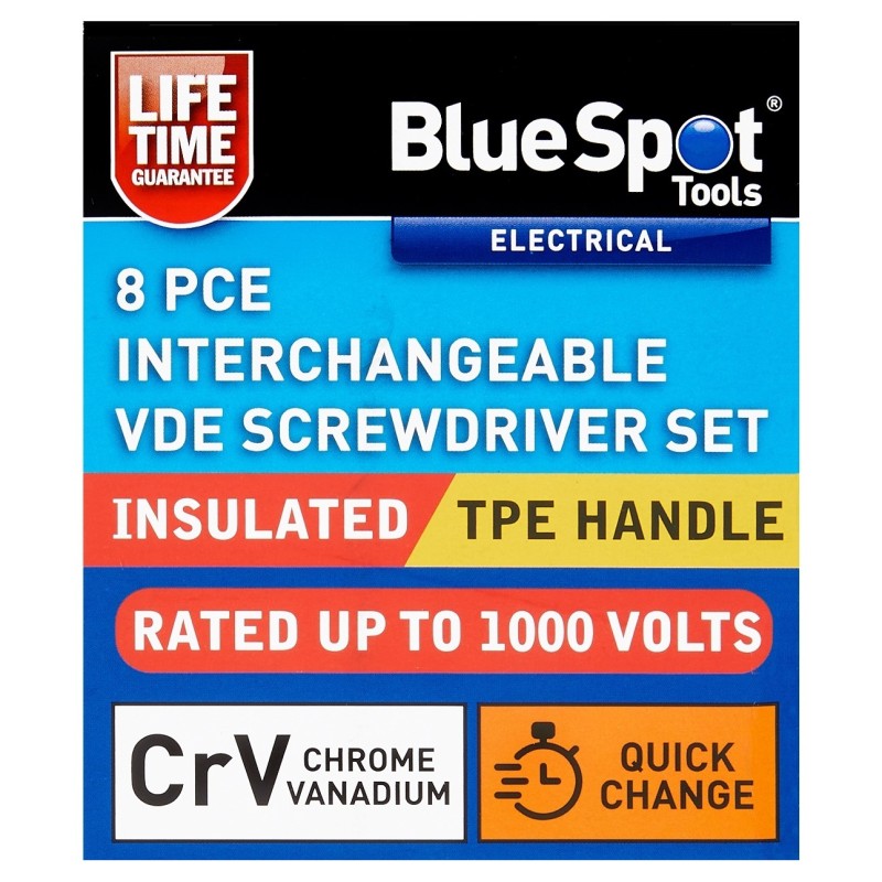 The Blue Spot Tools VDE Interchangeable Screwdriver 8pc Set 12061 is designed for professional electrical and installation work. Featuring an insulated handle and interchangeable VDE blades, it allows you to tackle a variety of fasteners with one compact tool.