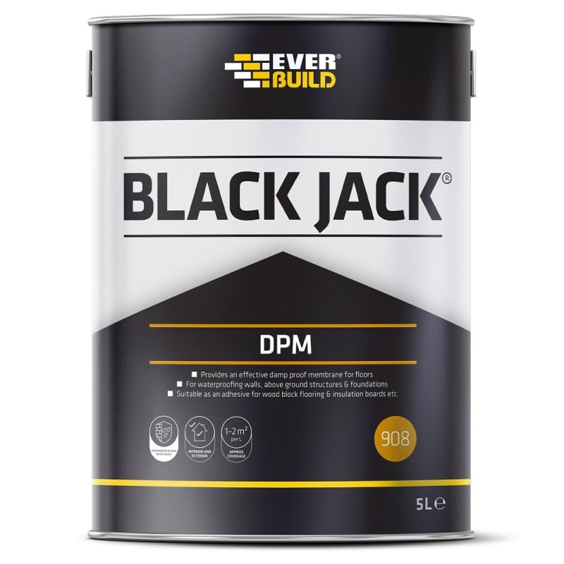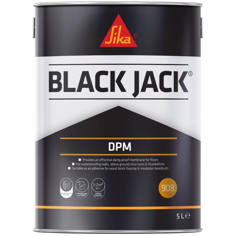 Sika Black Jack 908 DPM 5 Litre Liquid Damp Proof Membrane, The UK's most well known liquid Damp Proof Membrane an odourless, rubber enriched bitumen emulsion damp proof membrane a highly effective sandwich damp proof membrane for floors and walls, acts as a water proofer for floors and walls, above ground structures and foundations, this damp proof membrane can be used externally or internally.