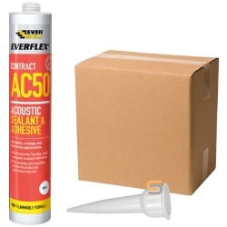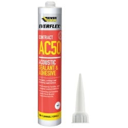 Everbuild Everflex AC50 White Acoustic Sealant and Adhesive Jumbo Large 900ml Tubes in a trade Box of 9 trade-size money saver deal for larger dry lining, partitioning and acoustic sealing jobs. Supplied in jumbo 900ml cartridges, this permanently flexible high-grab acoustic sealant and adhesive is designed for sealing gaps between plasterboard walls, floors and ceilings while also bonding plasterboard and kraft-lined insulation boards to common substrates.