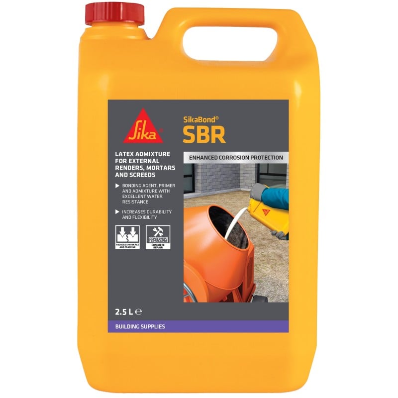 Sika SikaBond SBR + Waterproof Bonding Agent 2.5 Litre is a multi-purpose SBR latex designed to improve bonding and water resistance in cement-based mixes. Use it as a primer/bonding coat between old and new surfaces, or as an admixture to enhance mortars, screeds and renders for better adhesion, flexibility and reduced permeability.