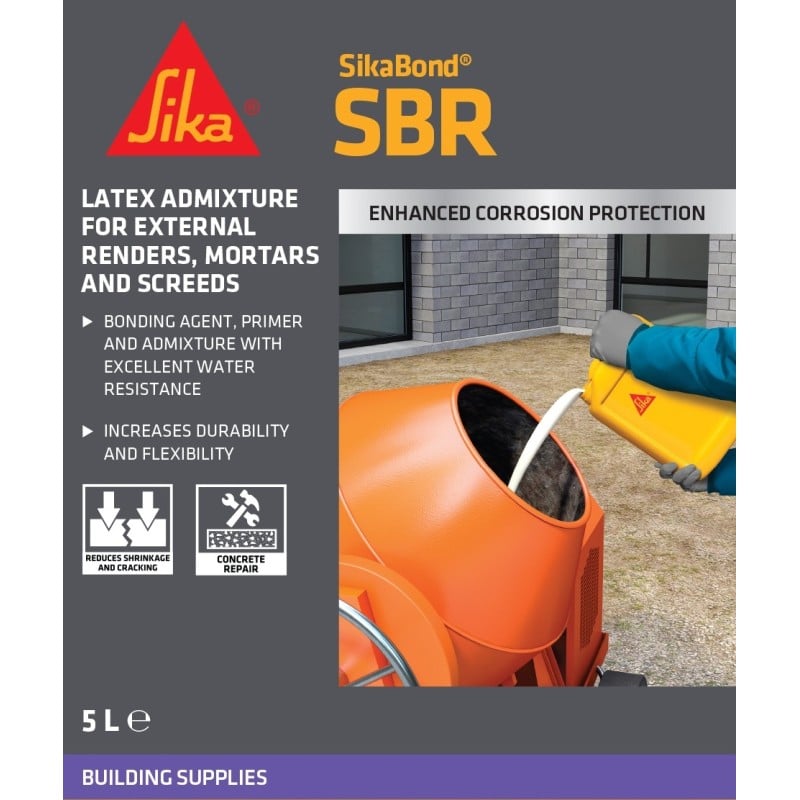 Sika SikaBond SBR+ 5 litre SBR PLUS is a one component, water based, general purpose, styrene butadiene rubber emulsion, when diluted with water it produces a gauging solution for improving adhesion, workability and waterproofing of mortars and cementitious mixes, reduces water to cement ratio for equivalent workability in mortars, making it easier to spread and allows mixes to be applied in much thinner sections.