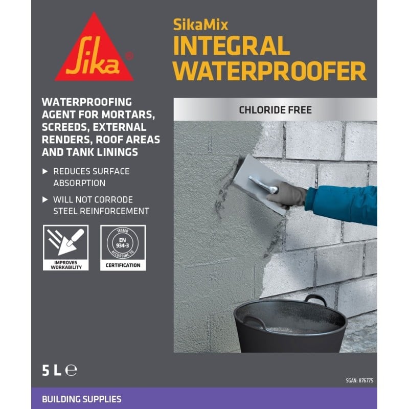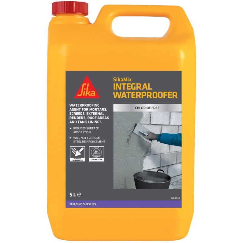 Sika SikaMix Integral Liquid Waterproofer Additive in a 5 litre tub a professional-grade admixture designed to reduce water permeability in cement-based mixes. Added to concrete, mortar, render or screeds, it helps create a more water-resistant finish that’s better protected against damp and water ingress in demanding areas such as basements, foundations and external walls.